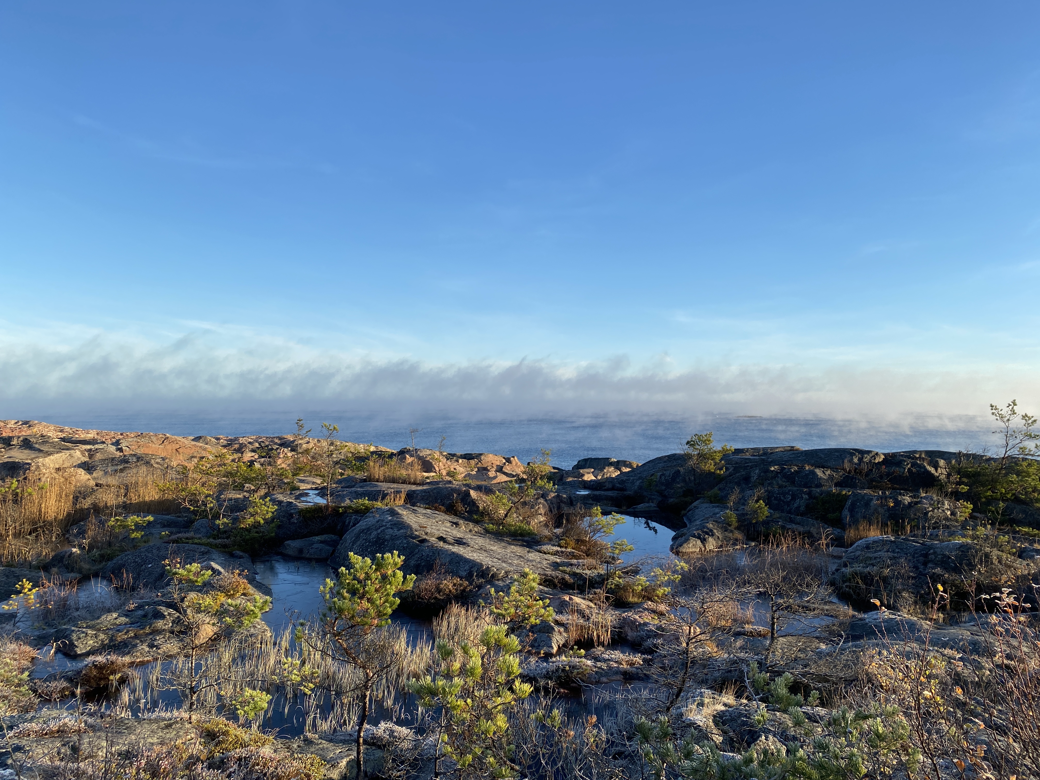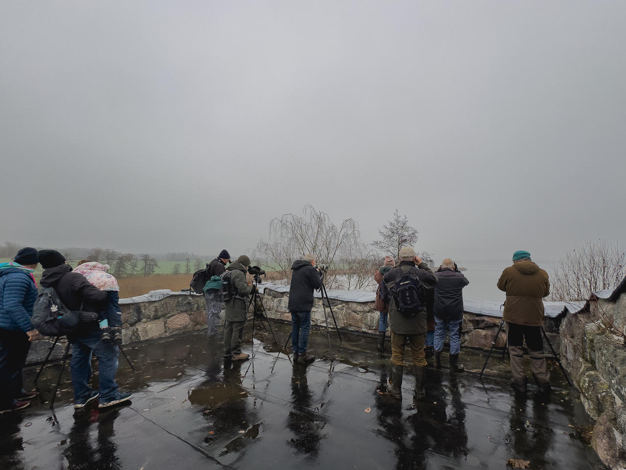 Strax efter solens uppgång var vi nio deltagare som spred ut sig på lätt frostiga klippor med blickarna ut över ett, i det närmaste stilla, hav. Endast en svag bris vidrörde våra nackar och en dimma låg ganska tät till en början och övergick endast långsamt till sjörök och därtill värmedaller skapat av olika temperaturer i luft och vatten. Allt var mycket vackert och stämningsfullt! Tyvärr innebar detta också att möjligheten att upptäcka fåglar var låg. Visserligen innebar avsaknad av vind och vågskvalp att det var lättare att upptäcka fåglar på deras läten men i strandskogen bakom oss var det endast små mängder av tillfälliga småfåglar. Däremot upptäcktes förbiflygande knipor på ljudet deras vingar skapade.